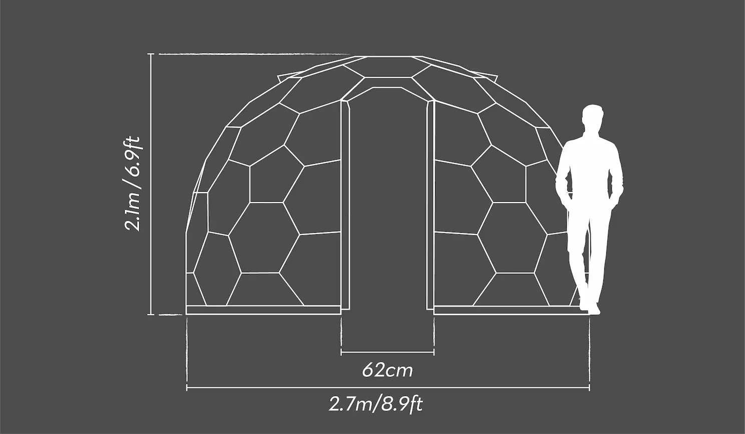 Mini: 2.7m (8.9ft) wide x 2.0m (6.5ft) high – ideal for compact gardens or cosy setups.